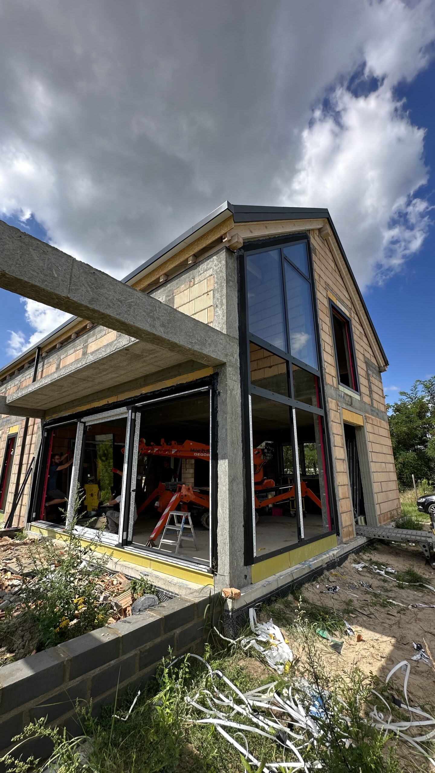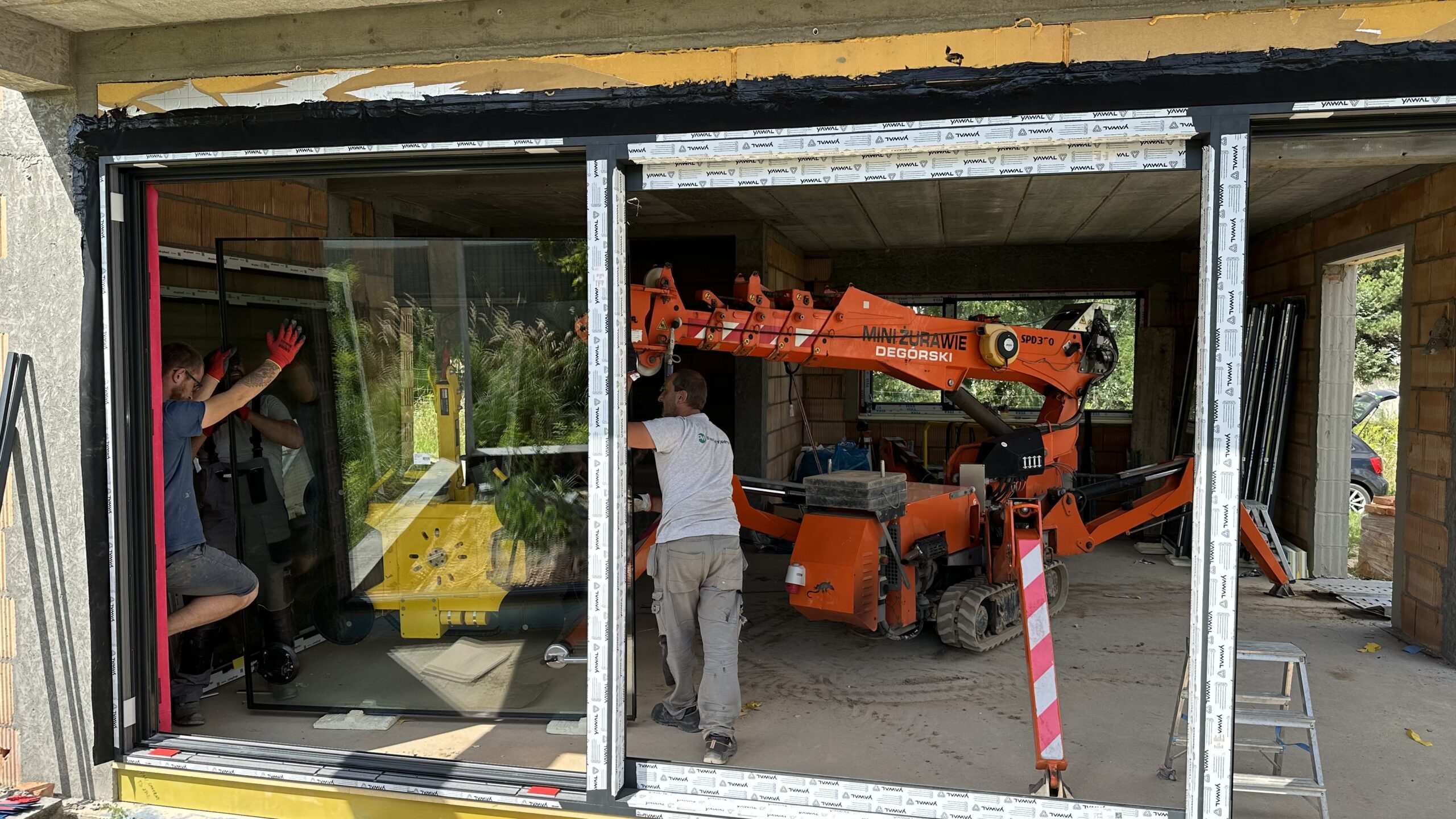 Już na etapie pobierania pomiarów na budowie okazało się, że projekt domu w Kellerisach G2 charakteryzuje się niezwykle dużymi przeszkleniami, w tym imponującym oknem w kształcie trapezu, obejmującym dwie kondygnacje budynku. W obliczu tych wyzwań, z uwagi na ograniczone możliwości konstrukcyjne profili PCV, postanowiliśmy zastosować konstrukcje aluminiowe.