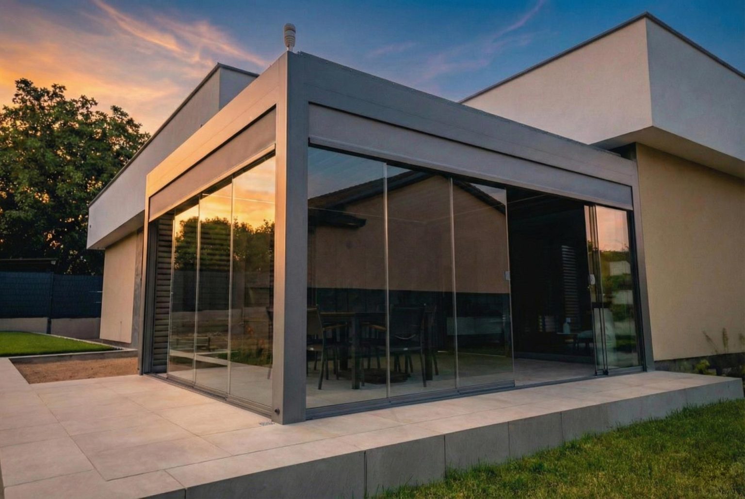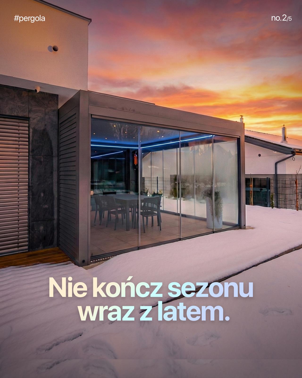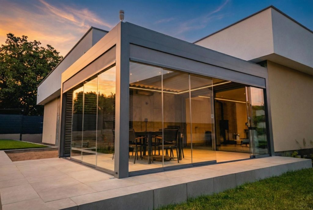 Przesuwne systemy szklane pozwalają zamknąć taras przed wiatrem, nie tracąc widoku. Całoroczna strefa komfortu.